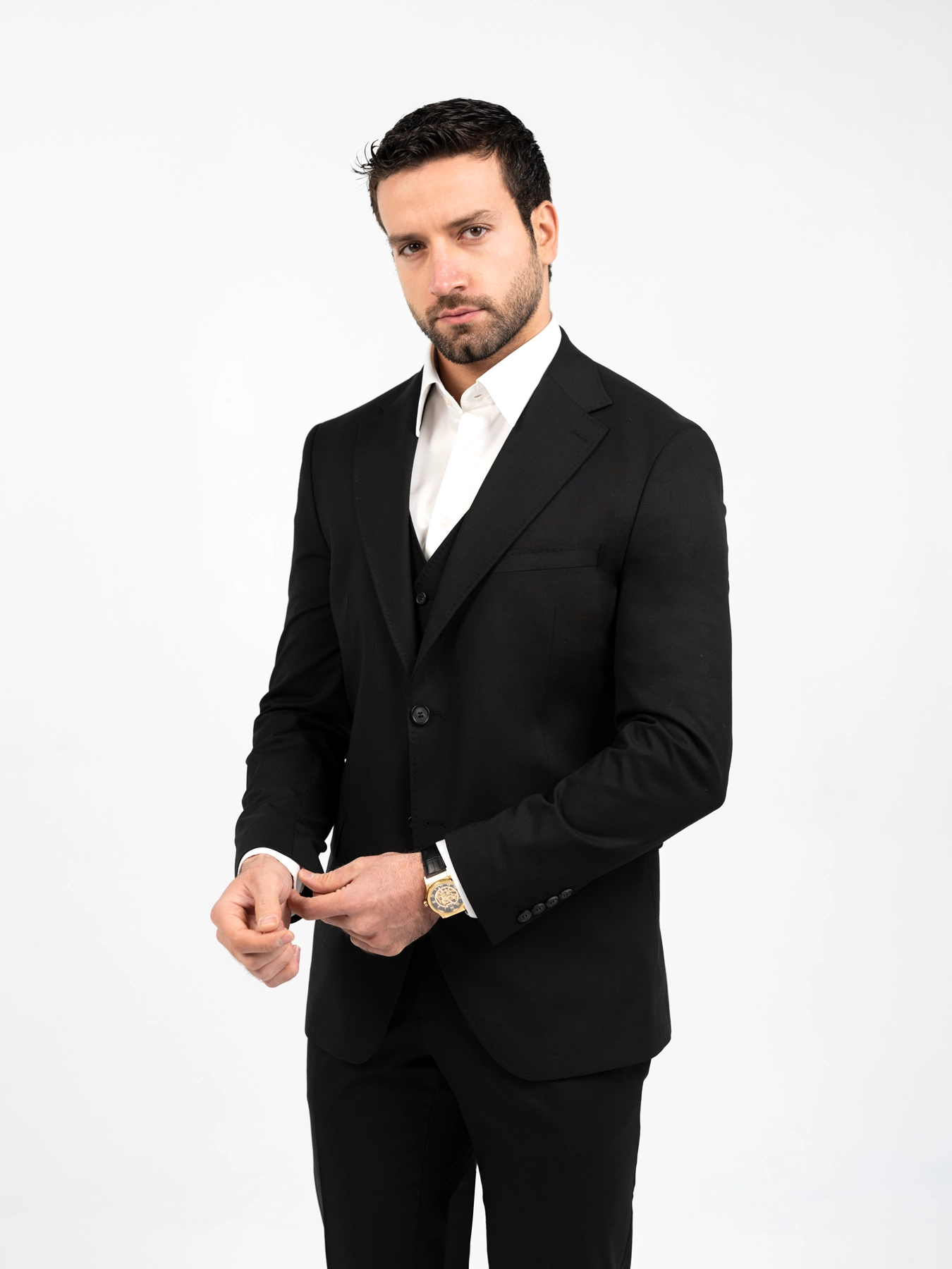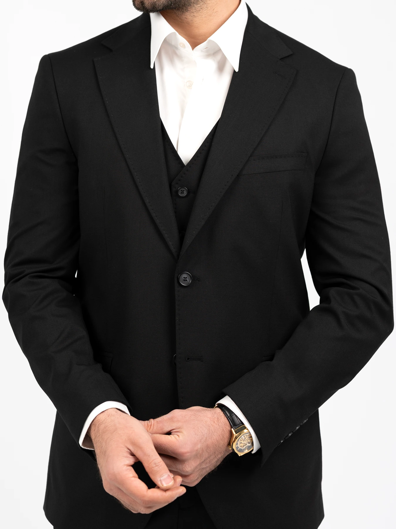 کت و شلوار فاستونی دو دکمه همراه با پیراهن و کروات، یک پایهی کلاسیک و رسمی است. برای کاملتر کردن استایل، میتوان آن را با موارد زیر ست کرد: