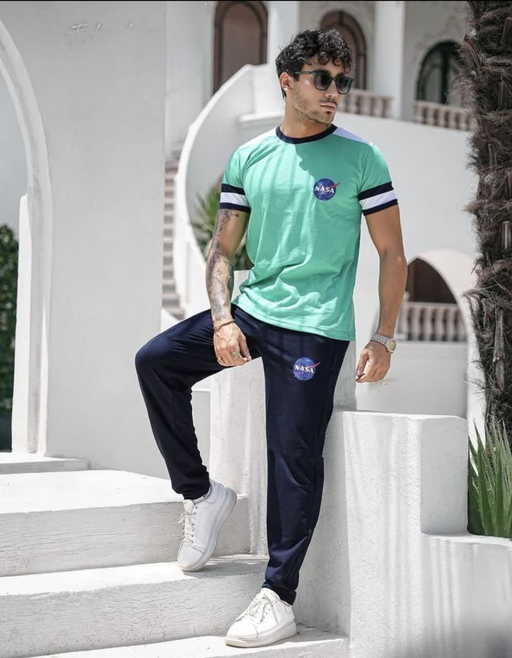 ست تیشرت آستین کوتاه یقه برگردان با شلوار بلند سورمه ای مردانه طرح Nasa تک رنگ