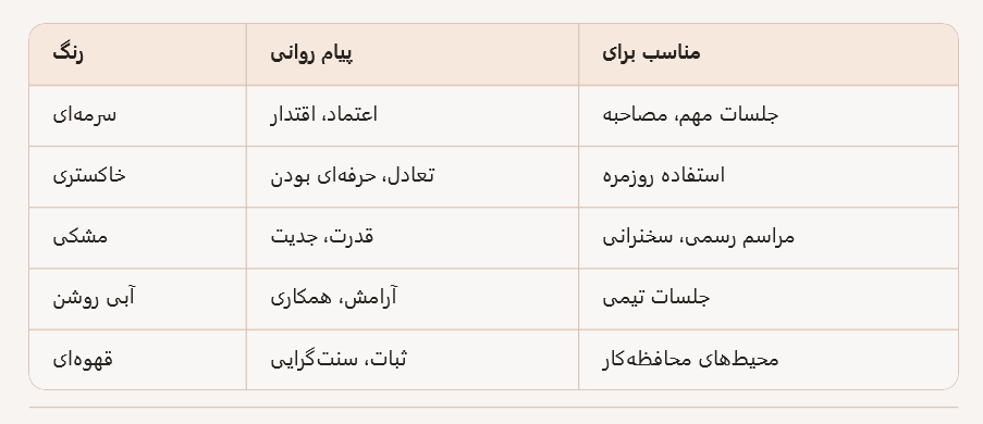- سرمهای، خاکستری تیره، ذغالی و مشکی بهترین گزینهها برای محیطهای رسمی هستند.
